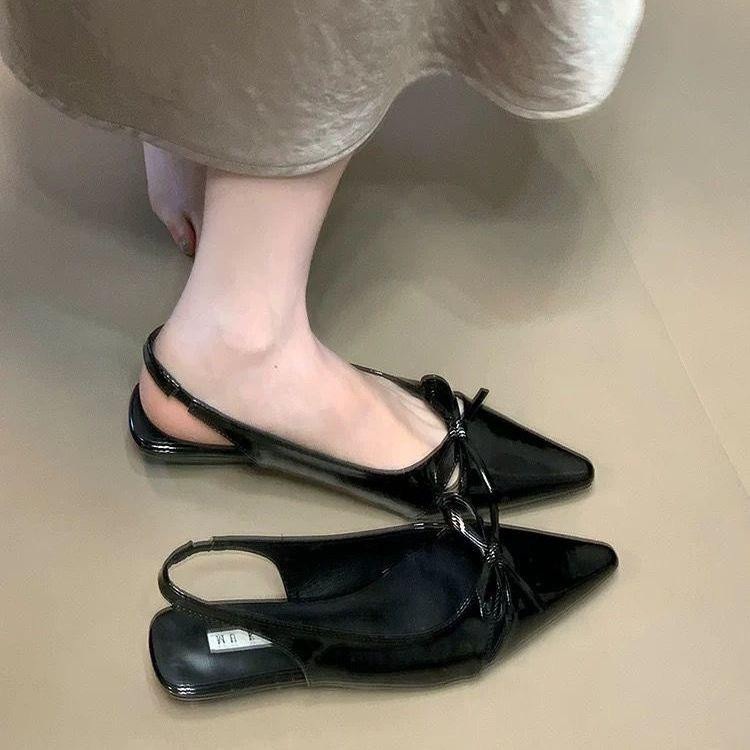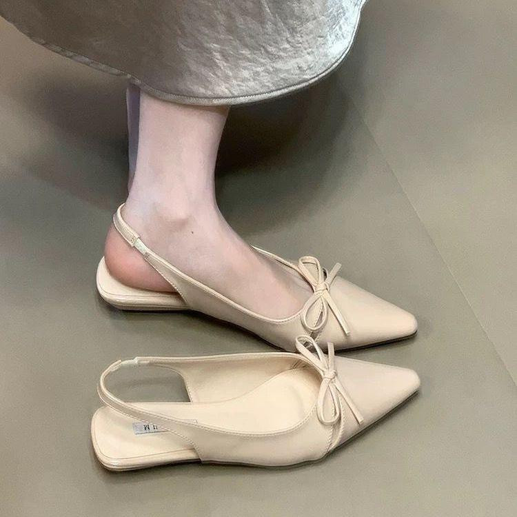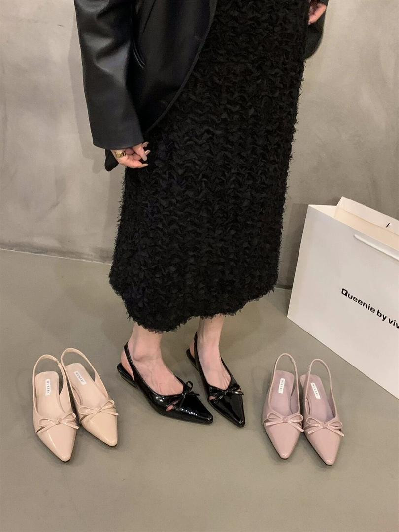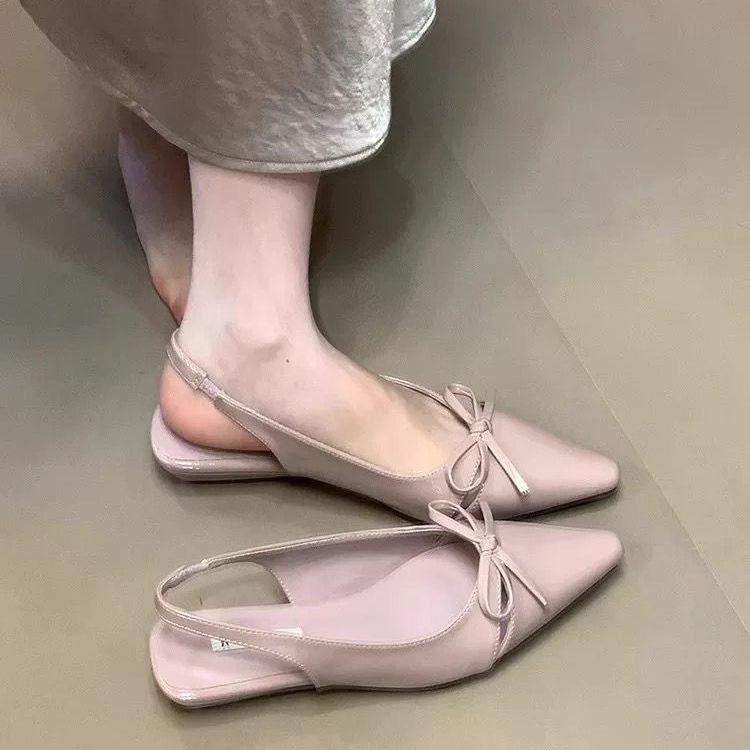 صندل نسائي بتصميم ناعم مقدّمة مدبّبة مع ربطة فراشة، بكعب مسطّح أنيق مناسب للارتداء اليومي والانتقال بين العمل والخروجات
