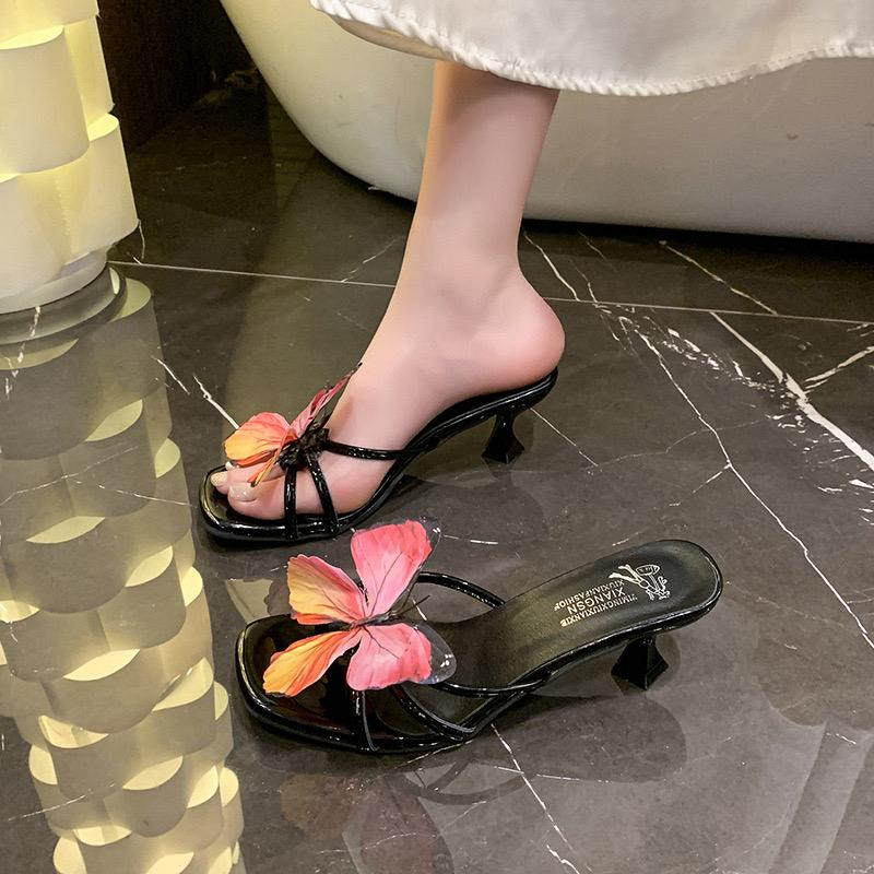 صندل نسائي مفتوح من الأمام مزين بفراشة ثلاثية الأبعاد بتصميم أنثوي فاخر بكعب متوسط،