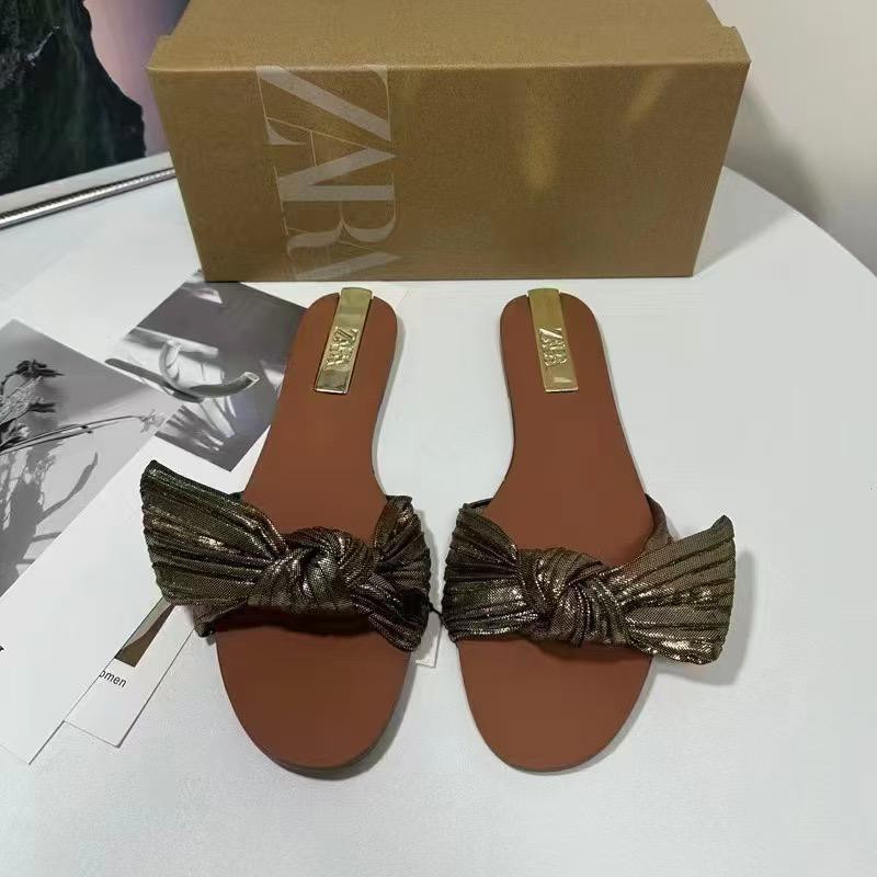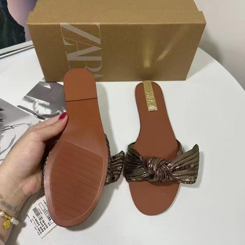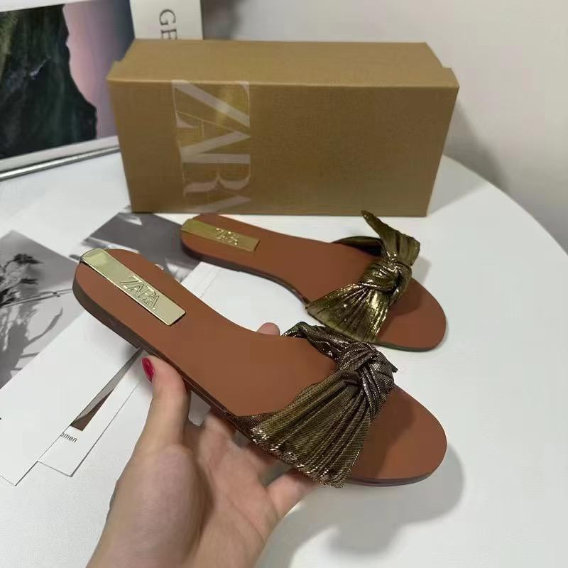 صندل نسائي مسطّح من ماركة ZARA بتصميم أنيق، مزين بفيونكة وزخرفة معدنية، مقدمة مكشوفة وكعب مسطّح مريح مناسب للمشي اليومي.