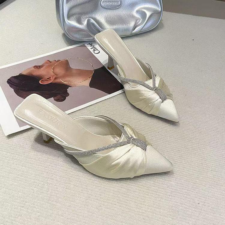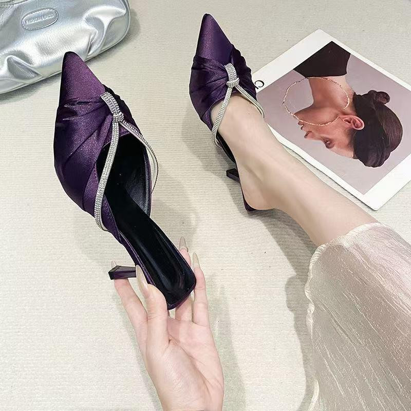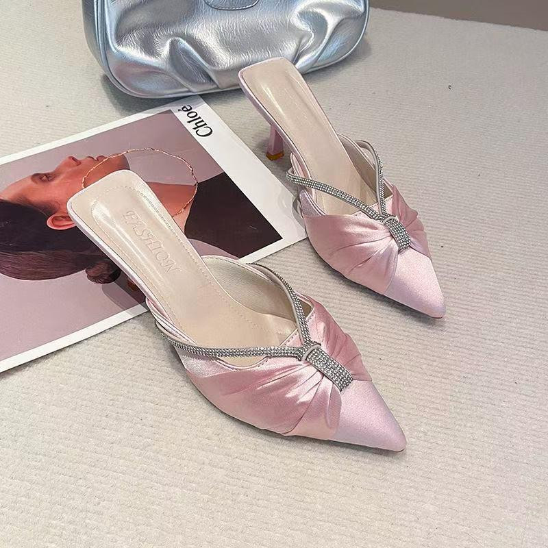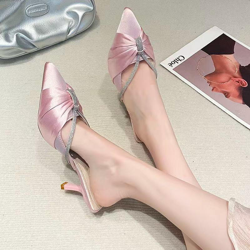 صندل نسائي صيفي بكعب عالٍ موضة 2025 بتصميم أنيق مفتوح من الخلف ومغلق من الأمام، مصنوع من قماش الساتان بلمعة فاخرة ومزيّن بحجر زركون لامع