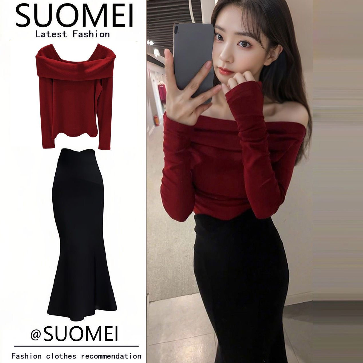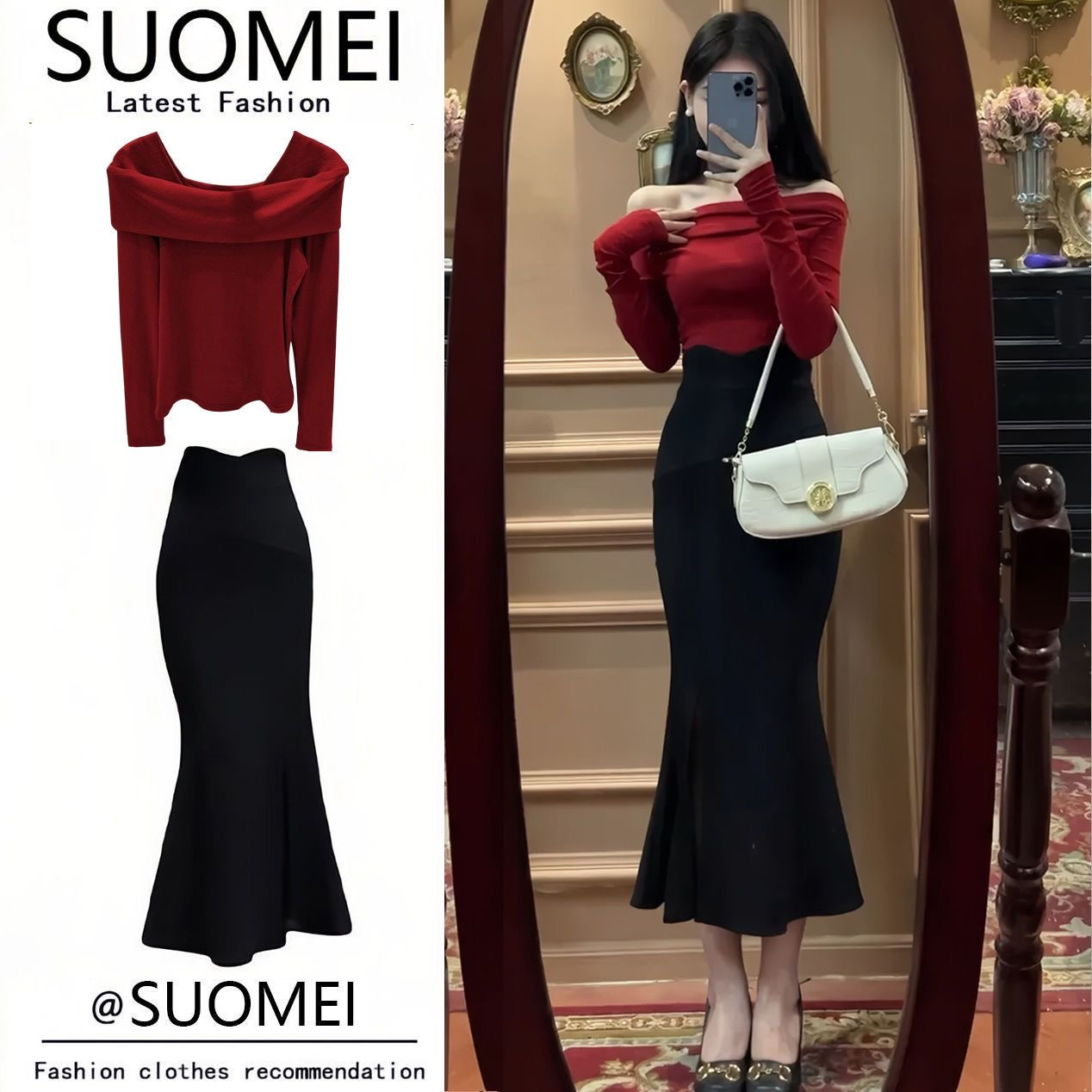 طقم بلوزة أوف شولدر مع تنورة ذيل السمكة وإكسسوار