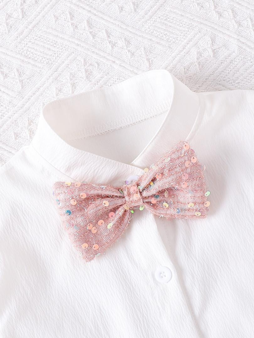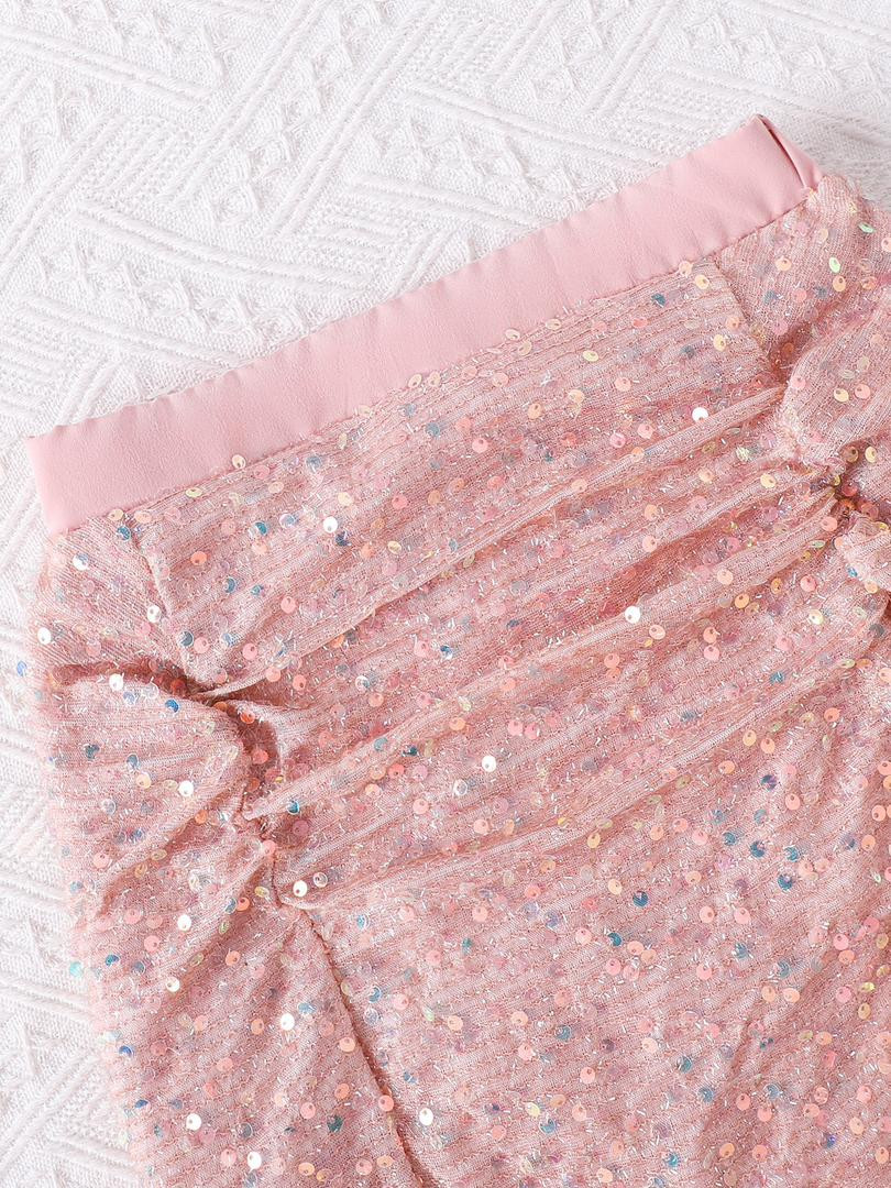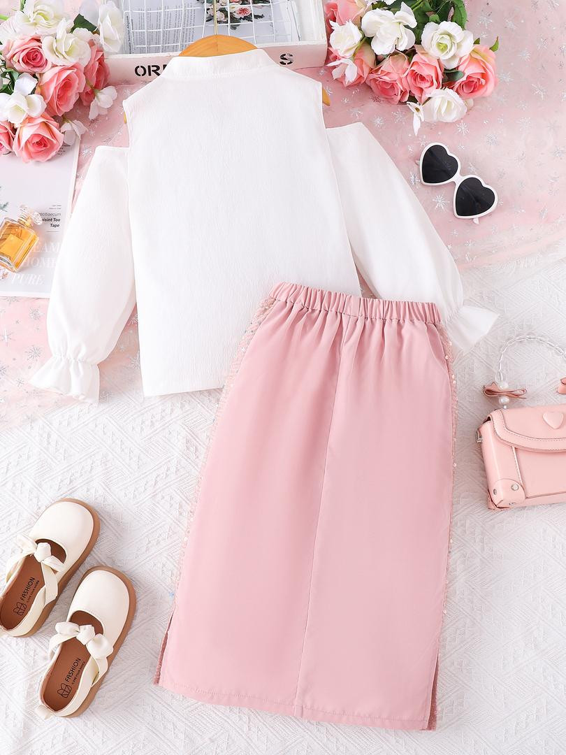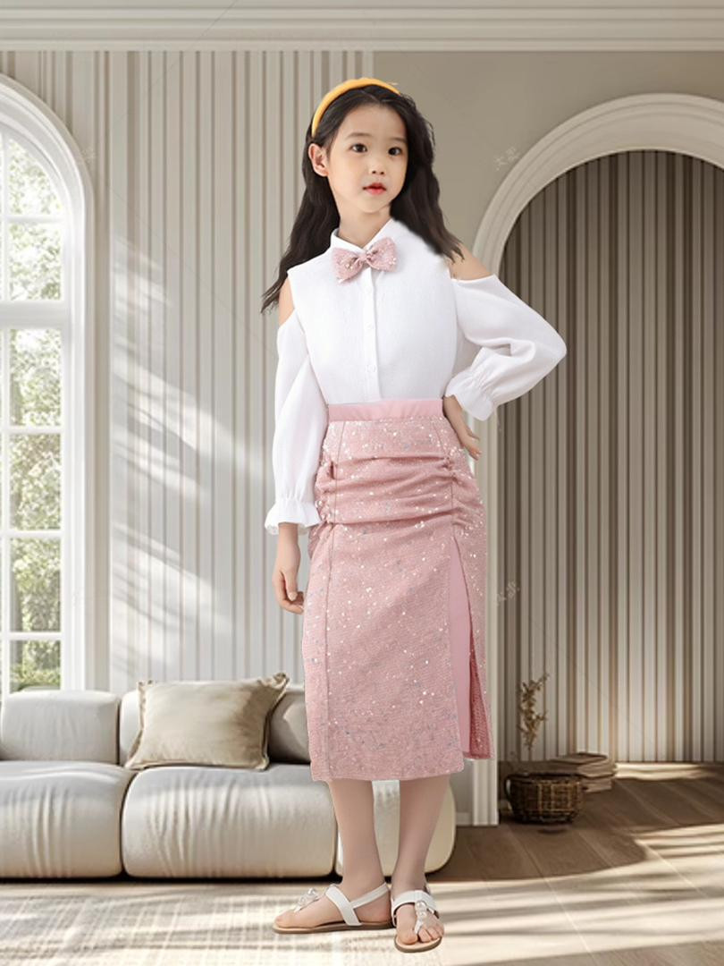 طقم بناتي خريفي – قميص طويل الأكمام مع تصميم أكتاف مكشوفة + تنورة قصيرة لامعة باللون الوردي (قطعتين)