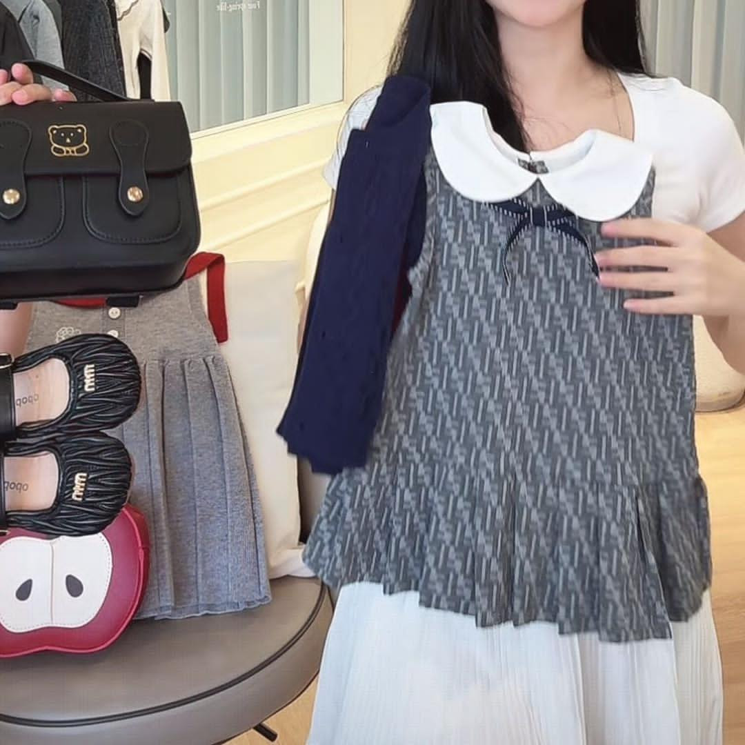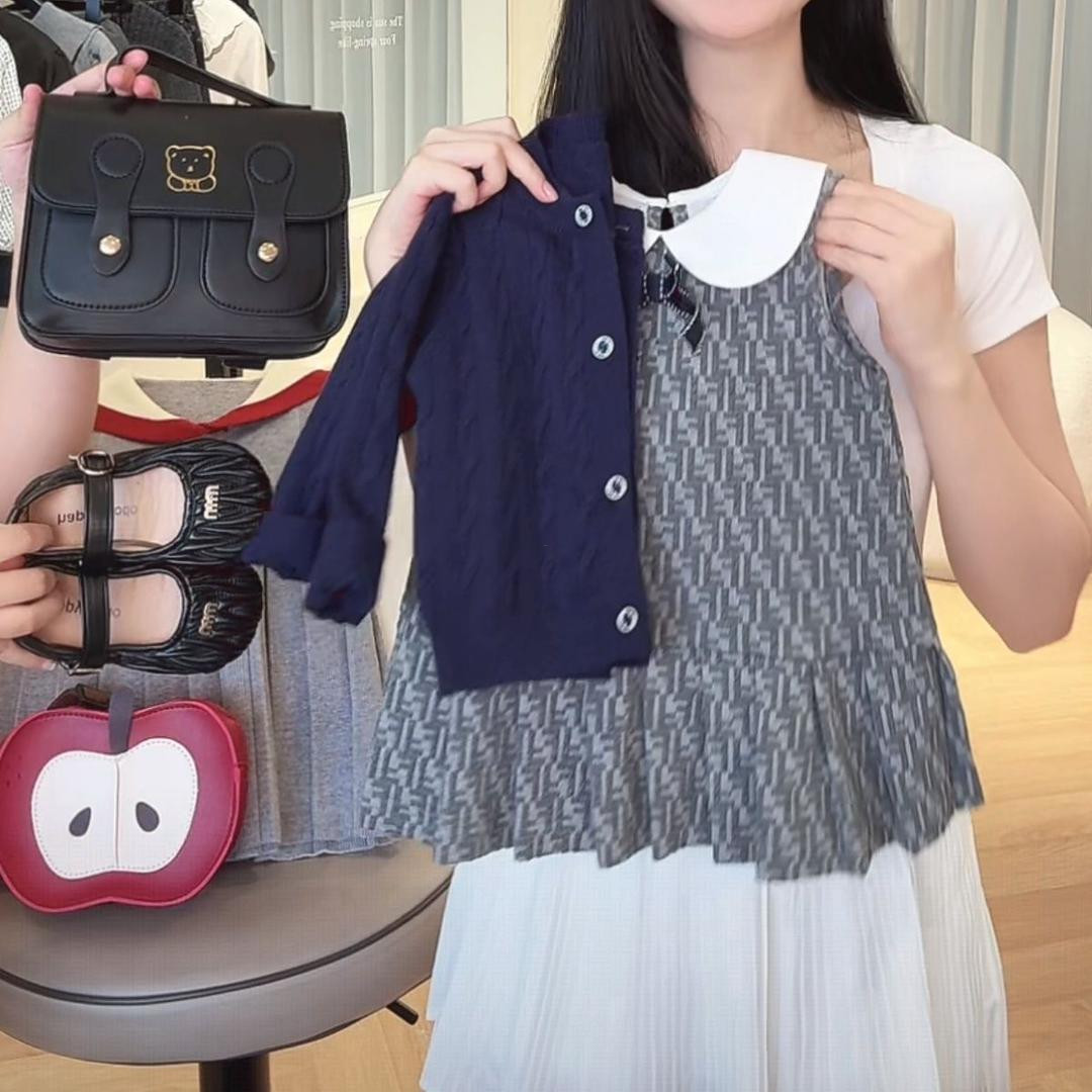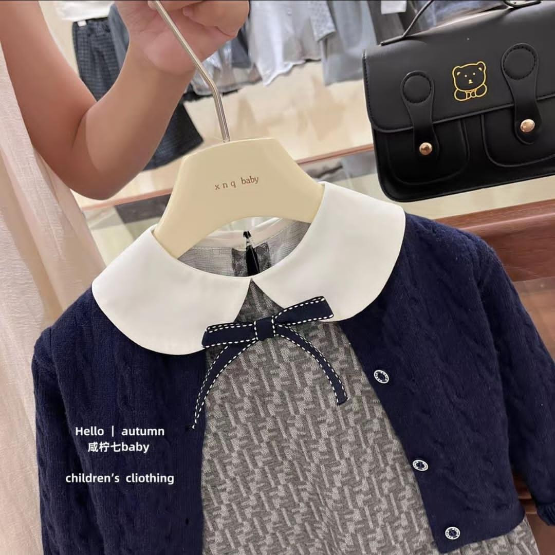 طقم بناتي كوري أنيق لموسم الخريف، يتكوّن من سترة تريكو باللون الكحلي مع فستان بحمالات مزين بفيونكة لطيفة، تصميم عصري وعملي يمنح طفلتك إطلالة دافئة