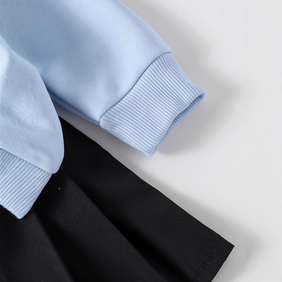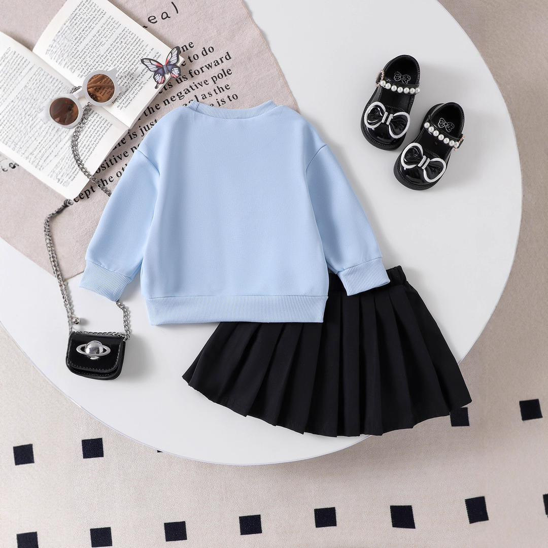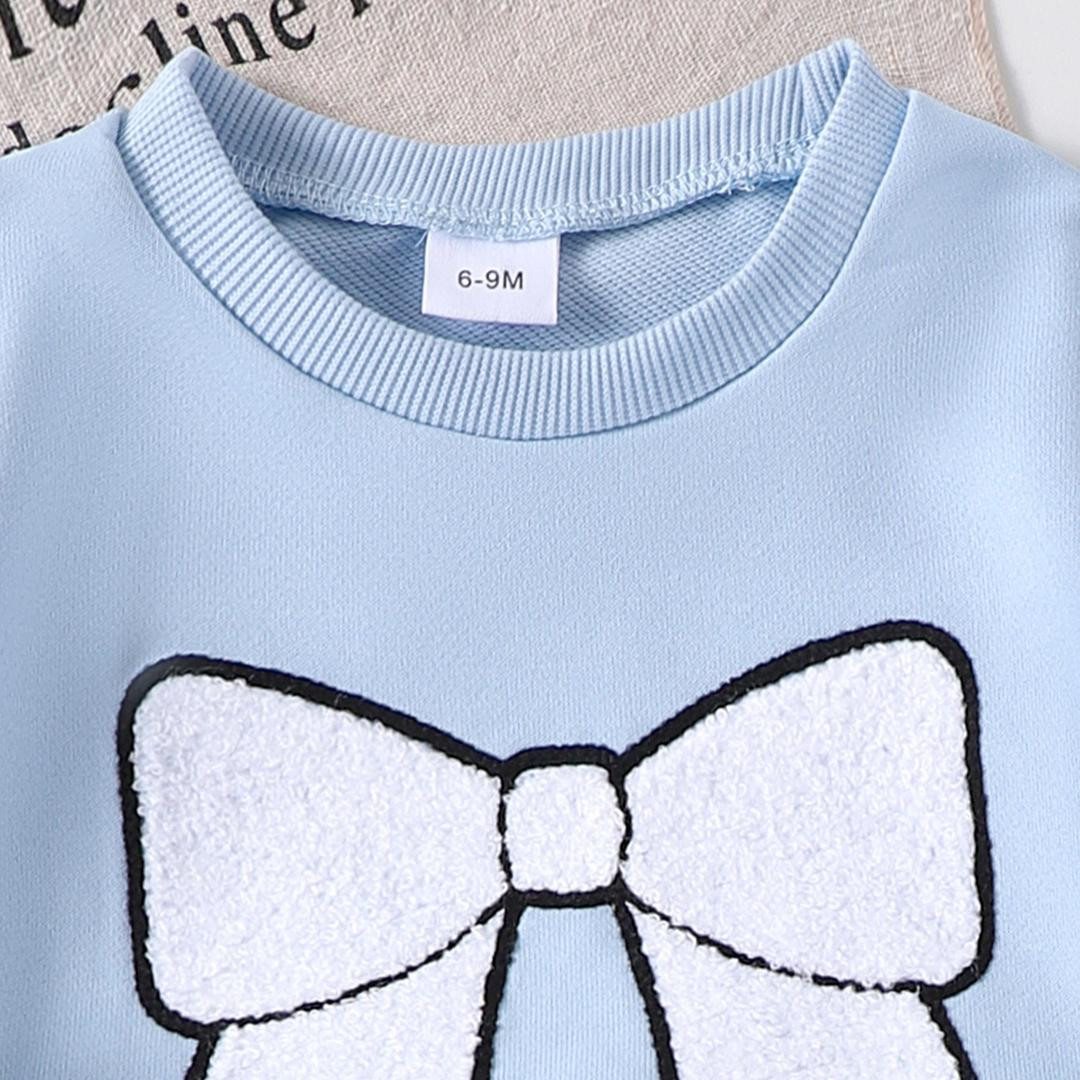 طقم بناتي شتوي أنيق بلوزة زرقاء مع فيونكة وتنورة كاجوال