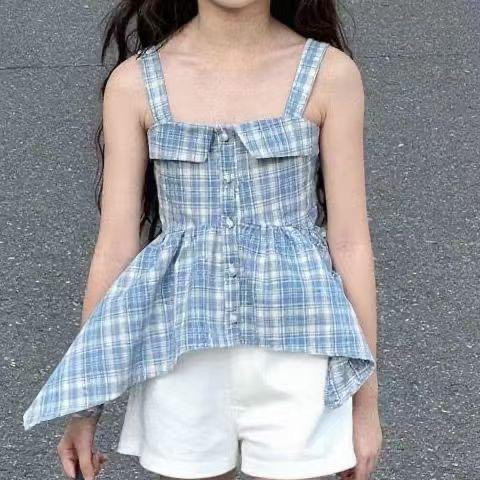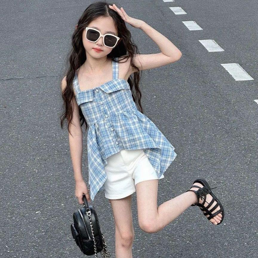 طقم بناتي صيفي - توب حمالة مربعات زرقاء مع شورت أبيض